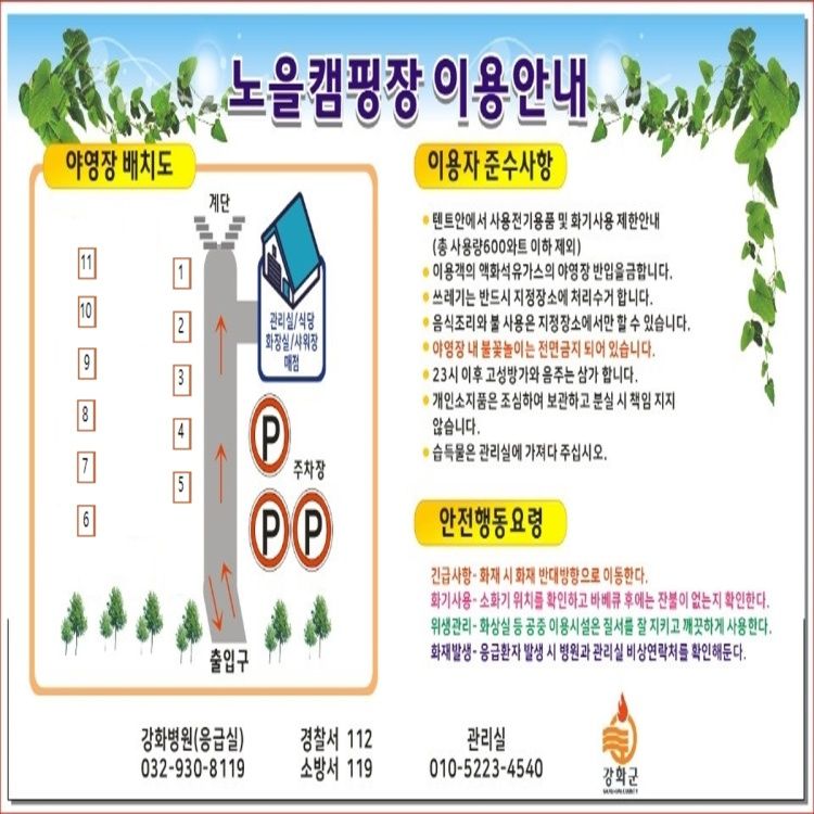 강화도 외포리에서 5분 거리에 있는 바다에 인접한 작은 캠핑장입니다. 개수대, 전기, 가스, 상수도, 무선인터넷 설치 되어있으며 캠핑장에 연결된 계단을 통해 바다로 나갈 수 있으며, 낚시 가능합니다. 영업시간은 1시 입실 11시 퇴실입니다. 데크사이즈는 4x4이며 타프 칠 수 있는 파쇄공간 있습니다. 카라반, 차박, 트레일러 이용은 1번부터 5번 데크까지만 가능합니다. 가족인원으로 성인 2, 아이 3명까지인 데크당 5인까지입니다. 1 데크에 성인 4명은 야간 소음문제로 불가합니다. 매너타임은 23시부터 이며 민원발생시 퇴실조치함에 동의하시면 예약부탁드립니다.