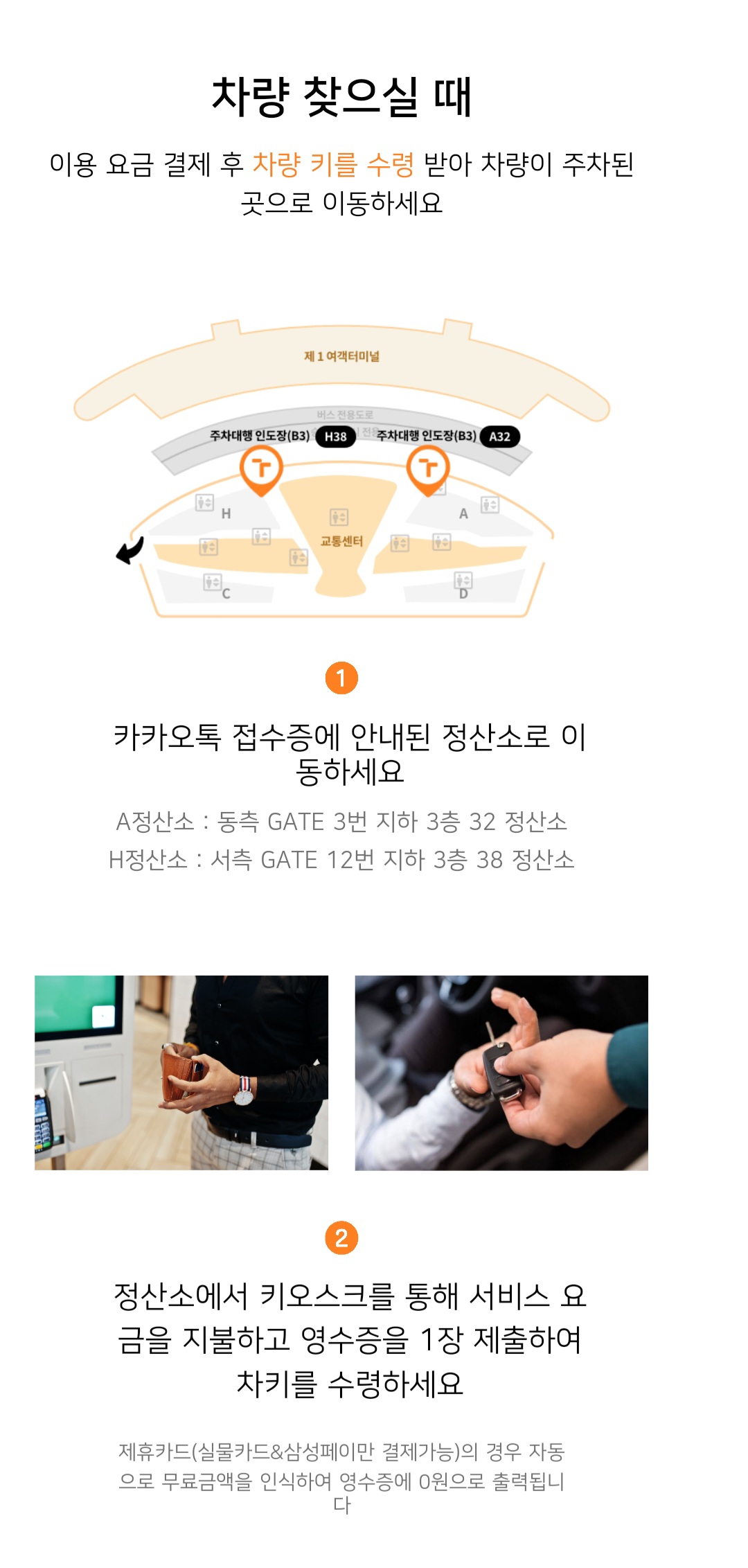 - 주차대행 접수증에 안내된 출차 장소로 이동 후 서비스요금을 지불하고 차량을 인도받으시면 됩니다.